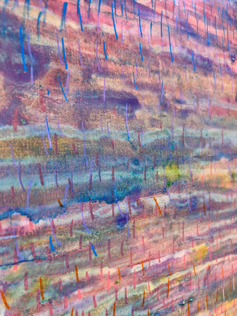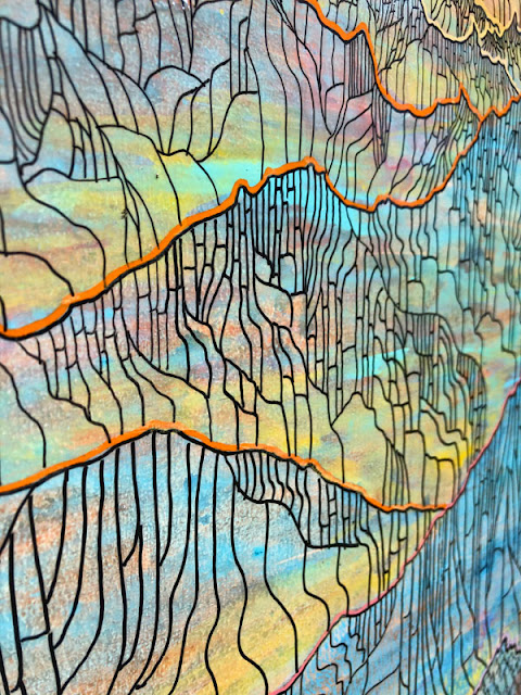 I love both glass mosaics as well as painting. I’ve began my journey as an artist as a painter. Eventually I found my way through working with stained glass. For over a decade I relished scoring and breaking glass, arranging them into abstract patterns that would emerge as landscapes. Today, I am once again drawn to mark making with paint and line. I approached this painting very freely without expectations. I just wanted to have fun, to explore. I was surprised to see what developed in front of me. I just ran with a certain feeling of the mountains and enjoyed this wonderful, colorful voyage.